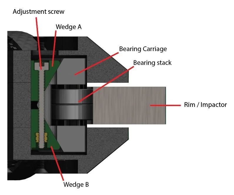 Adjustment screw pulls the two wedges (green) together, forcing the bearing carriage (white) radially into the rim