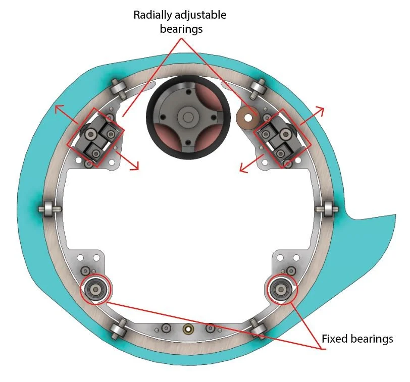 Bearing layout: note the 2 fixed bearings constraining the location of the circle and the 2 adjustable bearings preloading it