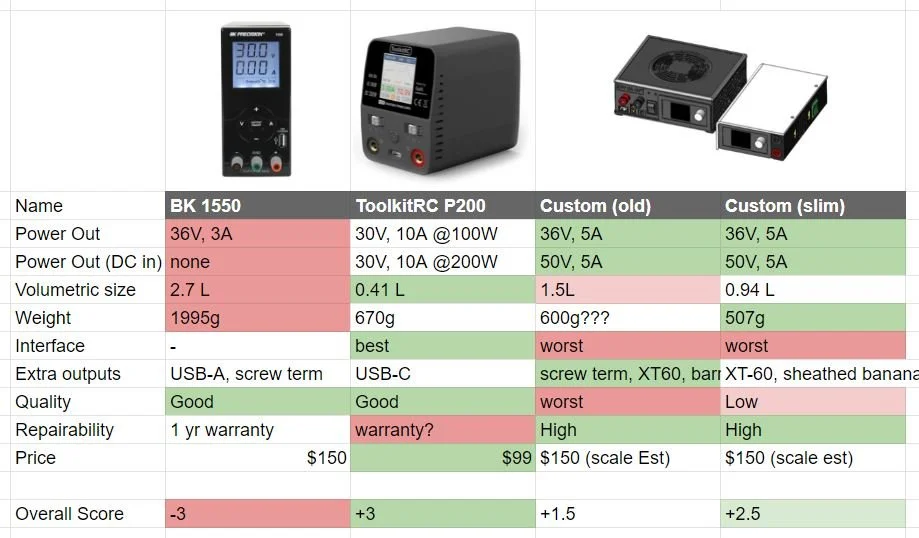 However, the ToolkitRC P200 power supply exists. It sacrifices a tiny bit of power delivery for a much better UI, while being than 50% smaller volumetrically and 33% cheaper. Unless you really like the flat, stackable design or need the XT60 output, the ToolkitRC is the clear choice from specs alone and reviews well to boot.