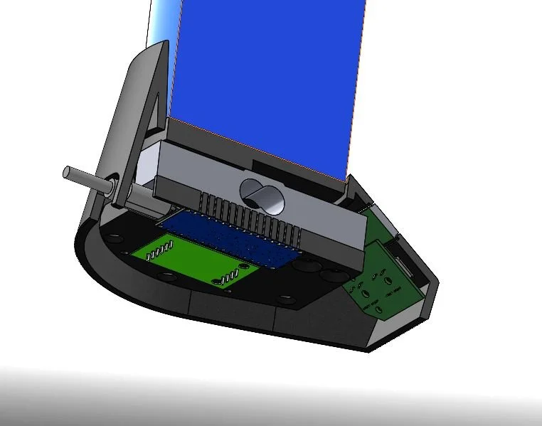 Cross section view showing the location of the load cell (silver), arduino (blue), USB cable, amplifier PCB (light green), and perfboard backplane for buttons (dark green)