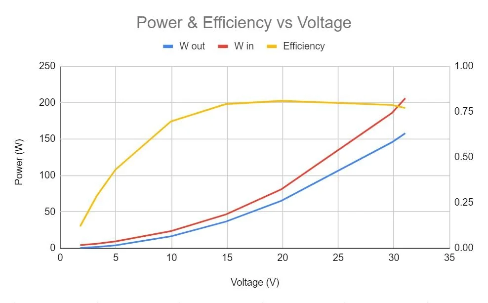 To confirm that the fan was doing an adequate job of ventilating the unit when fully enclosed, I performed the same 31V 6.1Ohm 158W test on an enclosed unit as I did in the final round of incremental testing. The thermistor visible through the cooling vent reads a lower temperature after reaching steady state, indicating better cooling performance. This isn’t as thorough by any means but is a good indicator that the active-convection enclosed system and the passive-convection open system perform similarly. I also did a secondary test with a thermocouple wedged underneath the AC common mode filter (the hottest component) at a safer 30V and it didn’t exceed it’s rated temperature when enclosed or unenclosed.
