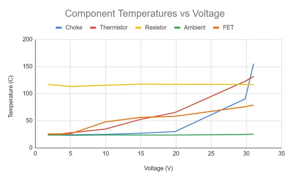 Graph of component temperatures under 6.1 Ohm load. Thermistor temperature scales well with the power output, but the AC filter or ‘choke’ scales near the square of power, causing an absurd overtemperature condition around 150W.