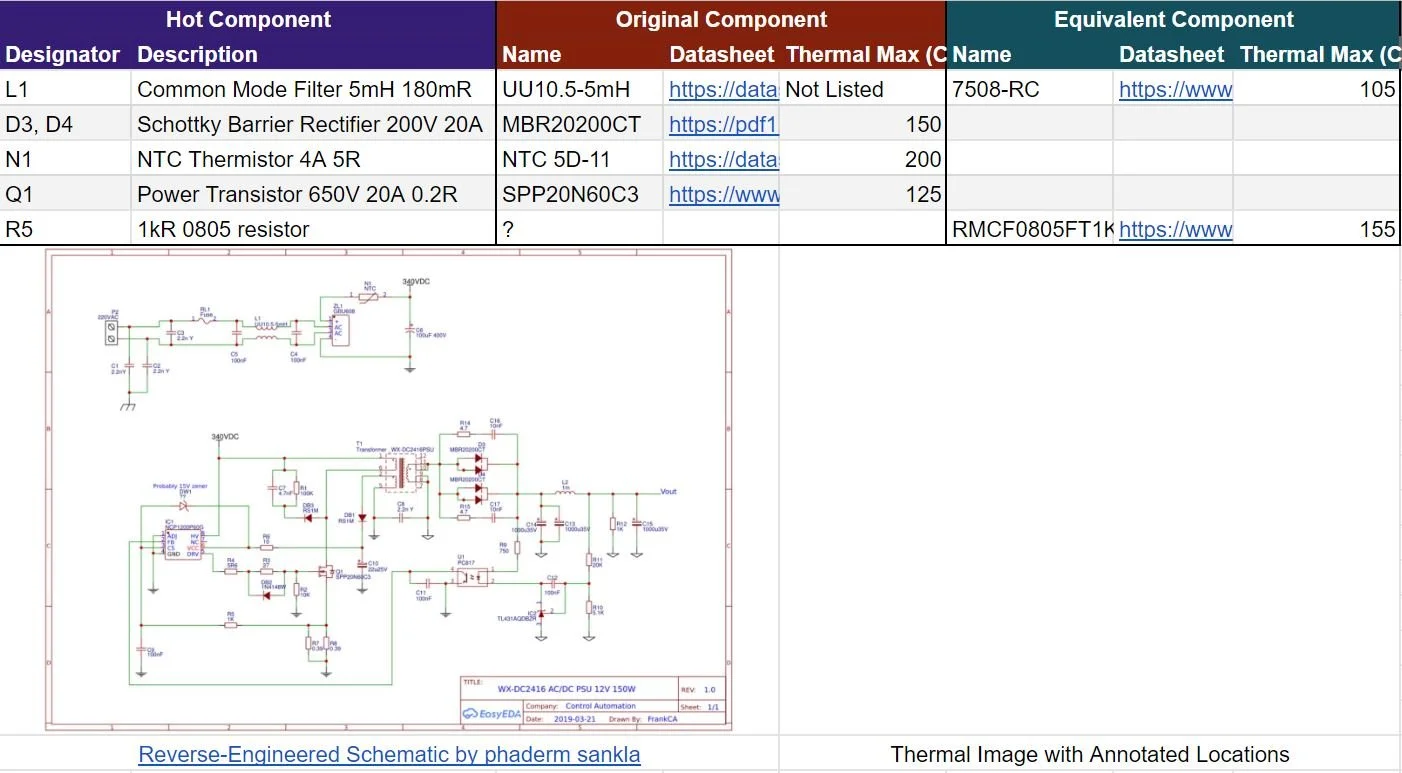 Based on a infrared image of the power supply at a 60W load for extended time, the chip markings, and a reverse-engineered schematic I found online, it was simple to identify the components that were generating the most heat. Cross referencing their datasheets (or a datasheet of the closest equivalent component I could find), I was able to find the maximum operating temperatures of all the thermally-limiting components. I documented this on my testing spreadsheet.