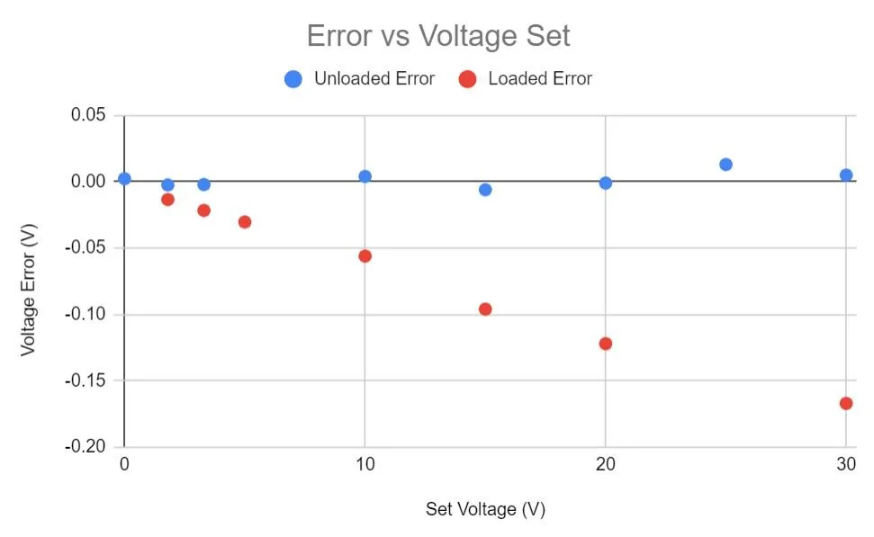 Errors are consistent and low with no error and linearly rise under max load. Likely source for this is the resistance of the test leads.